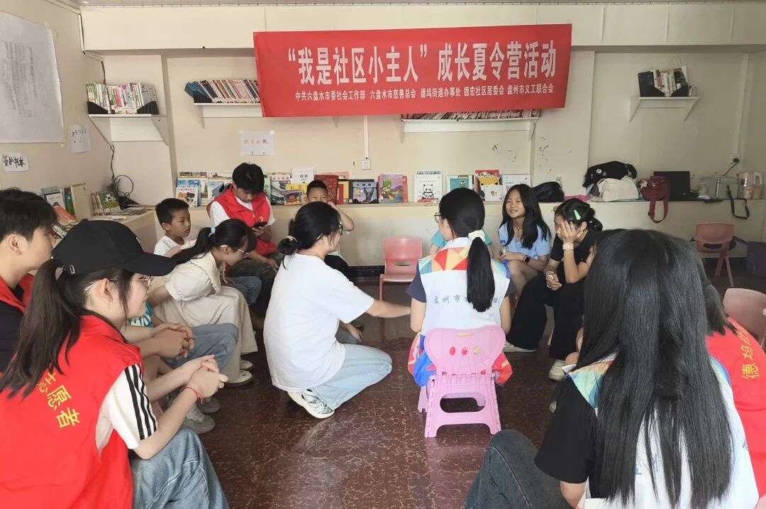 为助力社区儿童进一步了解认识社区,增强社区归属感,厚植主人翁意识;通过多元实践,提升社交、观察、解决问题等能力,促进儿童全面发展,增进社区融合。在中共六盘水市委社会工作部、六盘水市慈善总会、中共六盘水市钟山区委社会工作部、德坞街道办事处的悉心指导,以及北京市近邻社会工作发展中心的专业支持和施永青基金(香港)北京代表处的资助下,由盘州市义工联合会执行的德宏社区“宏德启智”儿童悦读屋项目于2025年7月28日—8月5日,在德宏社区皮鞋城开展“我是社区小主人”成长夏令营活动。7月28日在德宏社区居委会一楼悦读屋内,社工们组织开展夏令营开营仪式,为孩子们开启了一段充满意义的社区实践之旅。